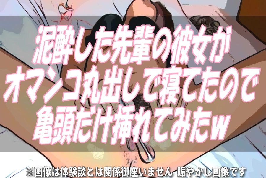 泥酔した先輩の彼女がオマンコ丸出しで寝てたので亀頭だけ挿れてみたw